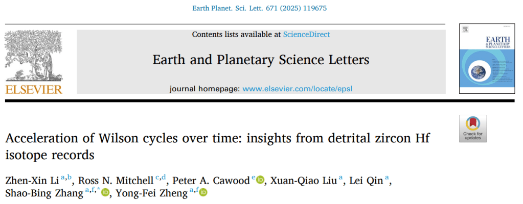 Li, Z. X., Mitchell, R. N., Cawood, P. A., Liu, X. Q., Qin, L., Zhang, S. B., & Zheng, Y. F. (2025). Acceleration of Wilson cycles over time: insights from detrital zircon Hf isotope records. Earth and Planetary Science Letters, 671, 119675.