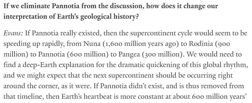 Avoiding Gondwana as a true supercontinent in the cyclicity is strong advocate of the 600 Myr and the 800 Myr cyclicities (Mitchell et al., 2021 and Zhao et al., 2018). The 600 Myr cyclicity is based on paleomagnetism and true polar wander which only recovers Columbia and Rodinia connected to Pangea. The 800 Myr cyclicity is based on a solid analysis of the geological records (metamorphism, paleogeography, etc.) and recovers Columbia and Rodinia and hypotheses a much older supercontinent called Kenorland at -2,500 Myr (All connected to Pangea in the sequence). The 500 Myr cyclicity is the based on the Wilson cycle theory and considers Gondwana a true supercontinent but fails to maintain a 400 to 500 Myr cyclicity throughout the Earth history (Pangea, at -300 Myr, Gondwana, at -600 Myr, Rodinia at -1,000 Myr, a supercontinent at -1,500, Columbia at -1,800 Myr and Kenorland at -2,500 Myr). Finally, considering Gondwana in the cyclicity mathematically leads you to the acceleration of the cycle… This was pointed out by Condie and Aster in their paper in 2013 (Figure 2), suggesting that the acceleration is a trivial question but yet having no scientific proof of it.